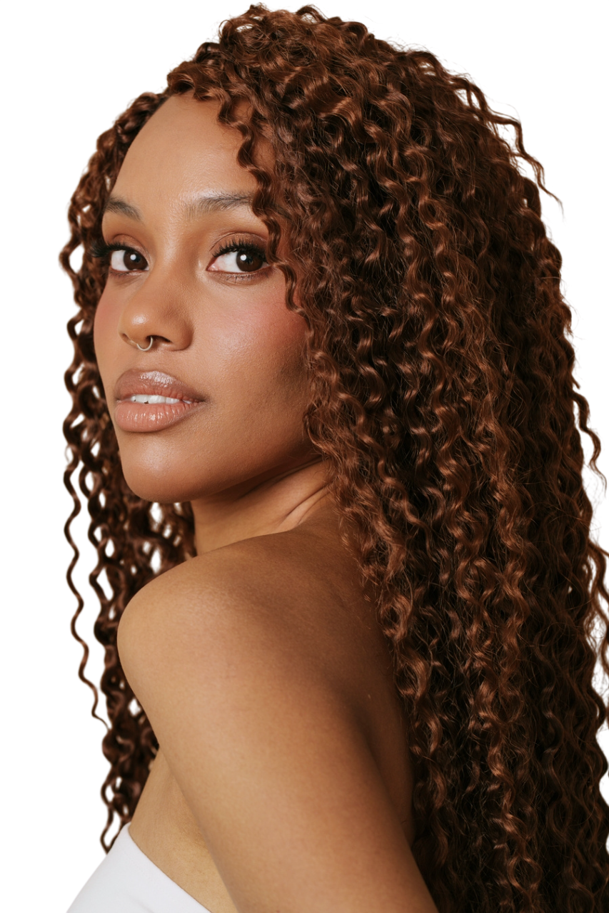 Crochet de rizos pequeños y definidos, con textura suave y ligera al tacto. Aporta volumen controlado y un acabado fresco y natural. Puedes lavar tu cuero cabelludo con el producto instalado.